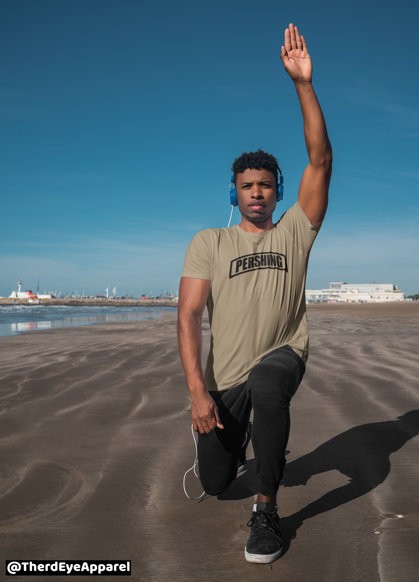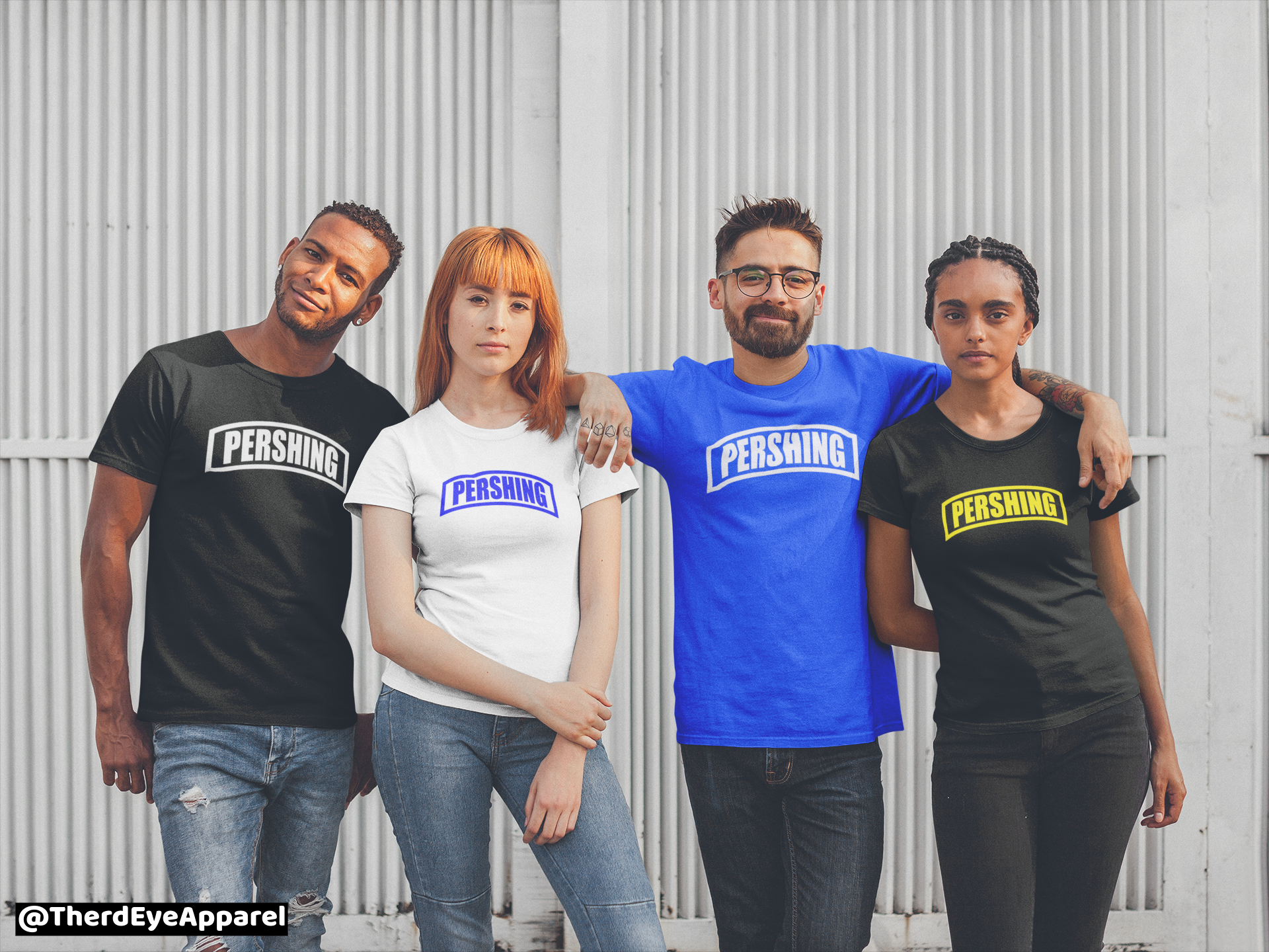 Shirts are Dri-fit material. Unisex sizes. Pershing Tab is centered on front chest of shirt with flag on right shoulder.